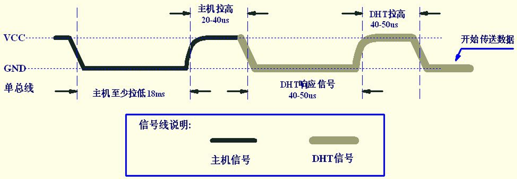 DHT11 一次完整的数据传输为40bit,高位先出。