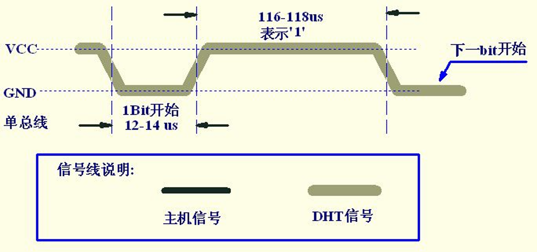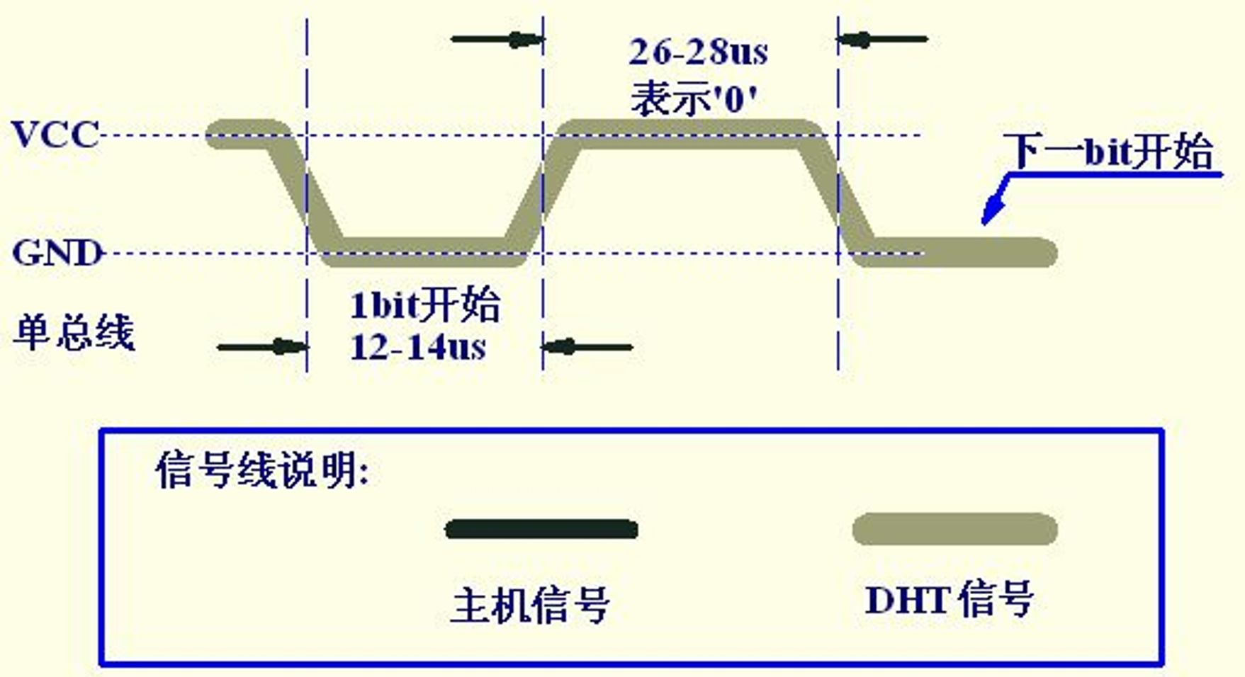 主机发送开始信号后,延时等待 20us-40us 后读取 DHT11 的回应信号,读取总线为低电平,说明 DHT11 发送响应信号,DHT11 发送响应信号后,再把总线拉高,准备发送数据,每一 bit 数据都以低电平开始,格式见下面图示。如果读取响应信号为高电平,则 DHT11 没有响应,请检查线路是否连接正常。