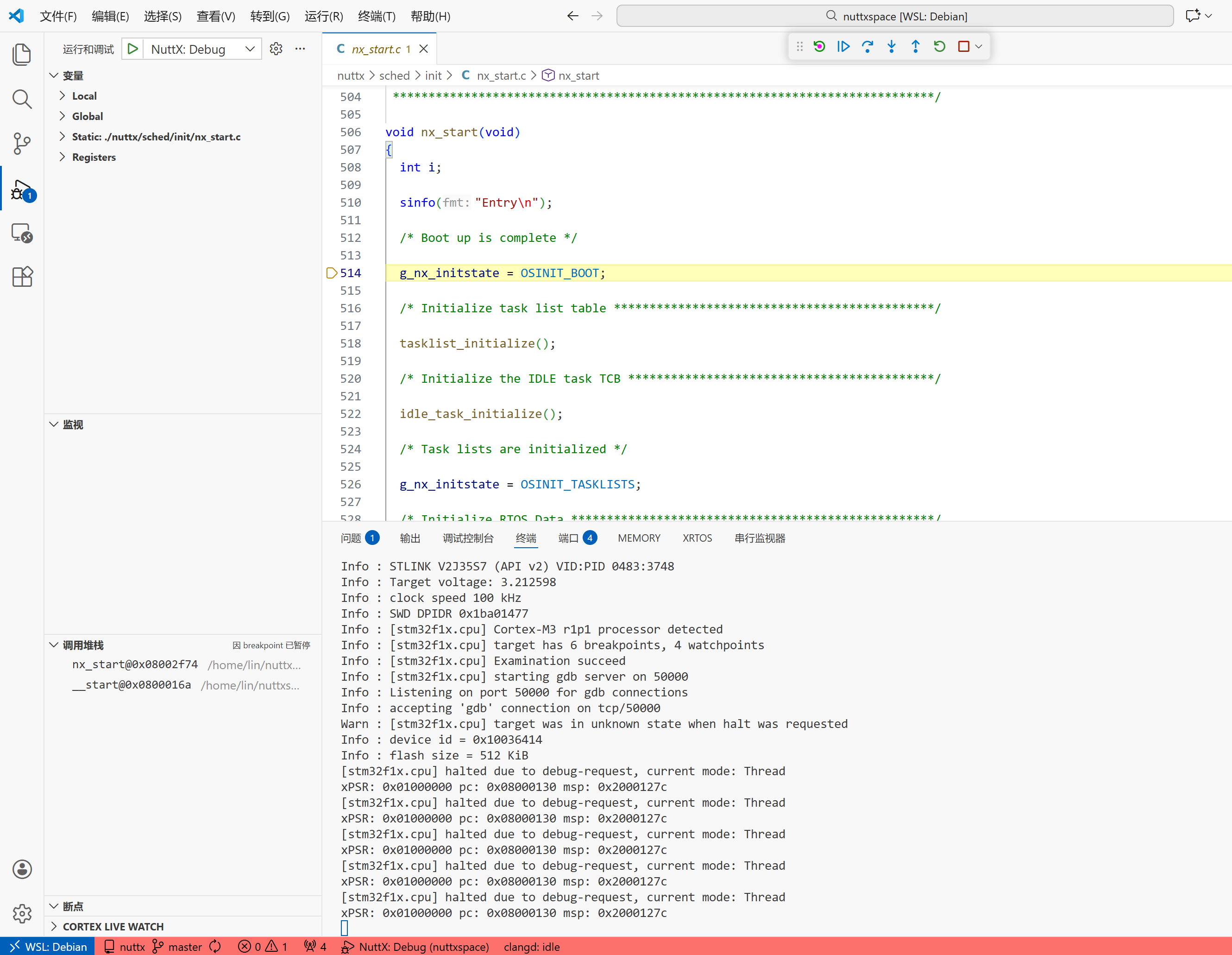 完成后使用 F5 开始调试,发现成功在 nx_start() 处停止。