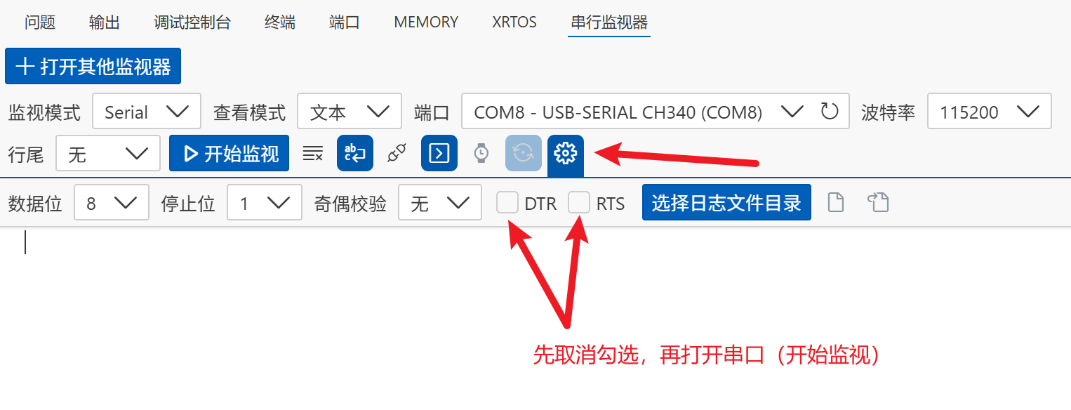 控制串口的 DTR 和 RTS 信号,在 VSCode 中安装 Serial Monitor 扩展,取消 DTR 和 RTS 的勾选,然后打开串口。有了这个插件以后 MobaXterm 其实就用不到了,之后都可以用这个插件来进行串口通信。
