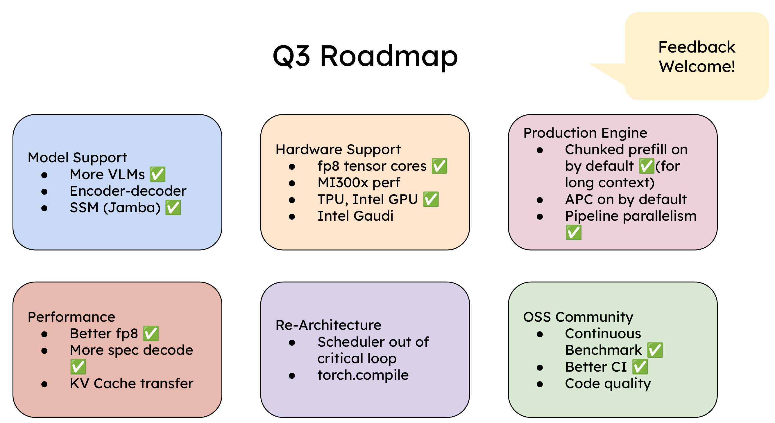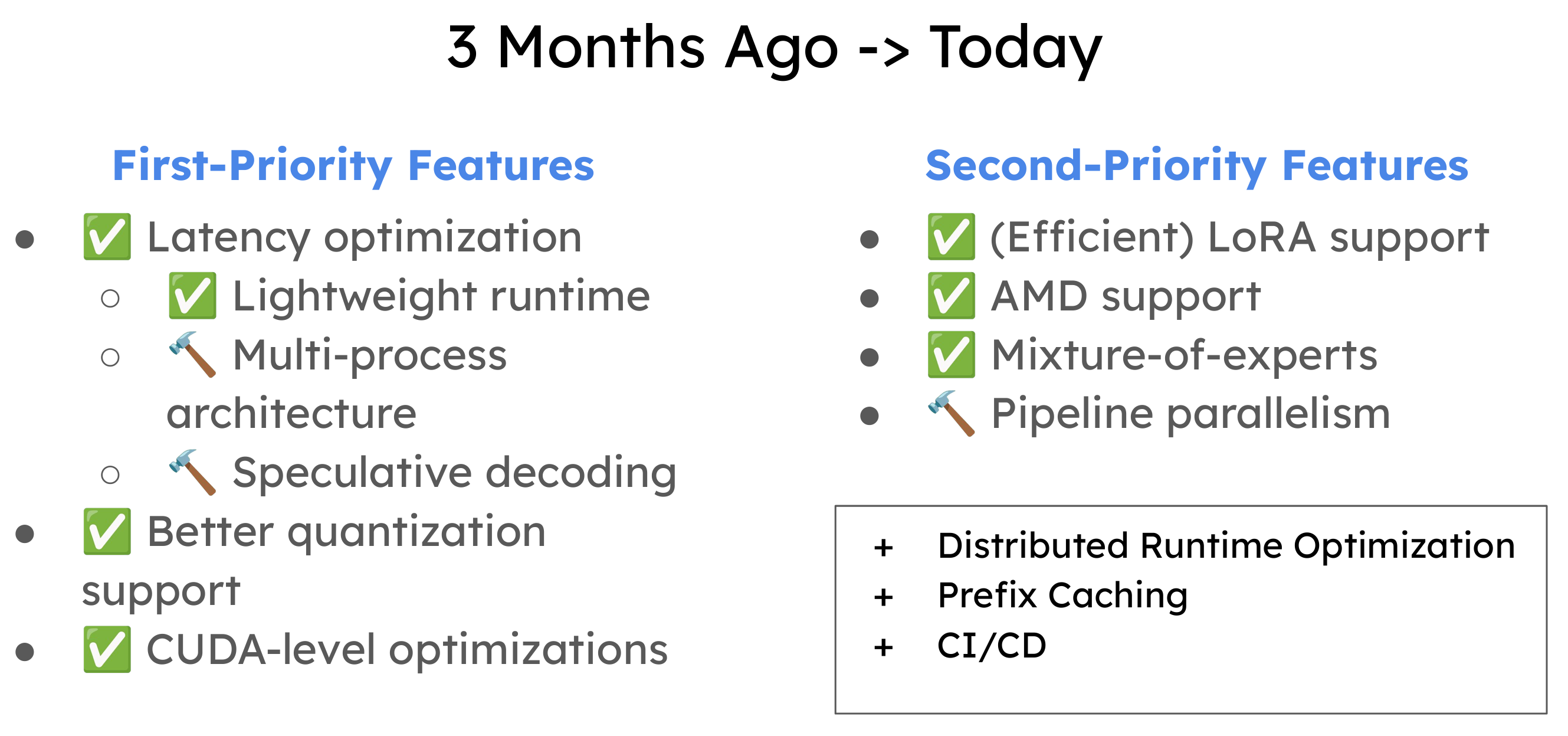 vLLM 横向扩展(支持多种模型、丰富的功能特性、多样化的硬件后端)做的很好,但纵向整合(各功能独立开发,缺乏整合、很难将各种优化方案在各种模型上结合起来)不行,并且在过去的 1.5 年里,vLLM 累积了不少技术债务。