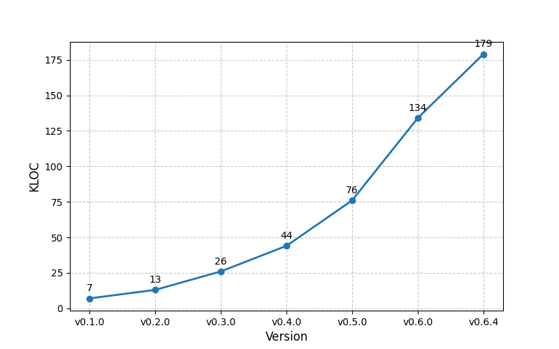 可以看到从去年的 v0.1.0(2023.06.20)到现在最新的 v0.6.4(2024.11.15),代码行数从 7 千行增加到了现在的将近 18 万行。间隔 514 天,平均每天增加了 334 行新代码,可以看到发展得非常快。