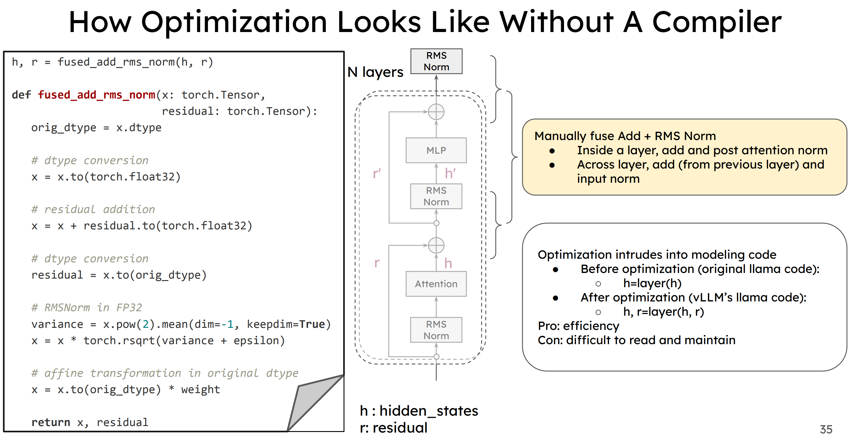 没有编译器时的优化(融合残差链接和归一化),提高了计算效率但代码可读性和可维护性变差